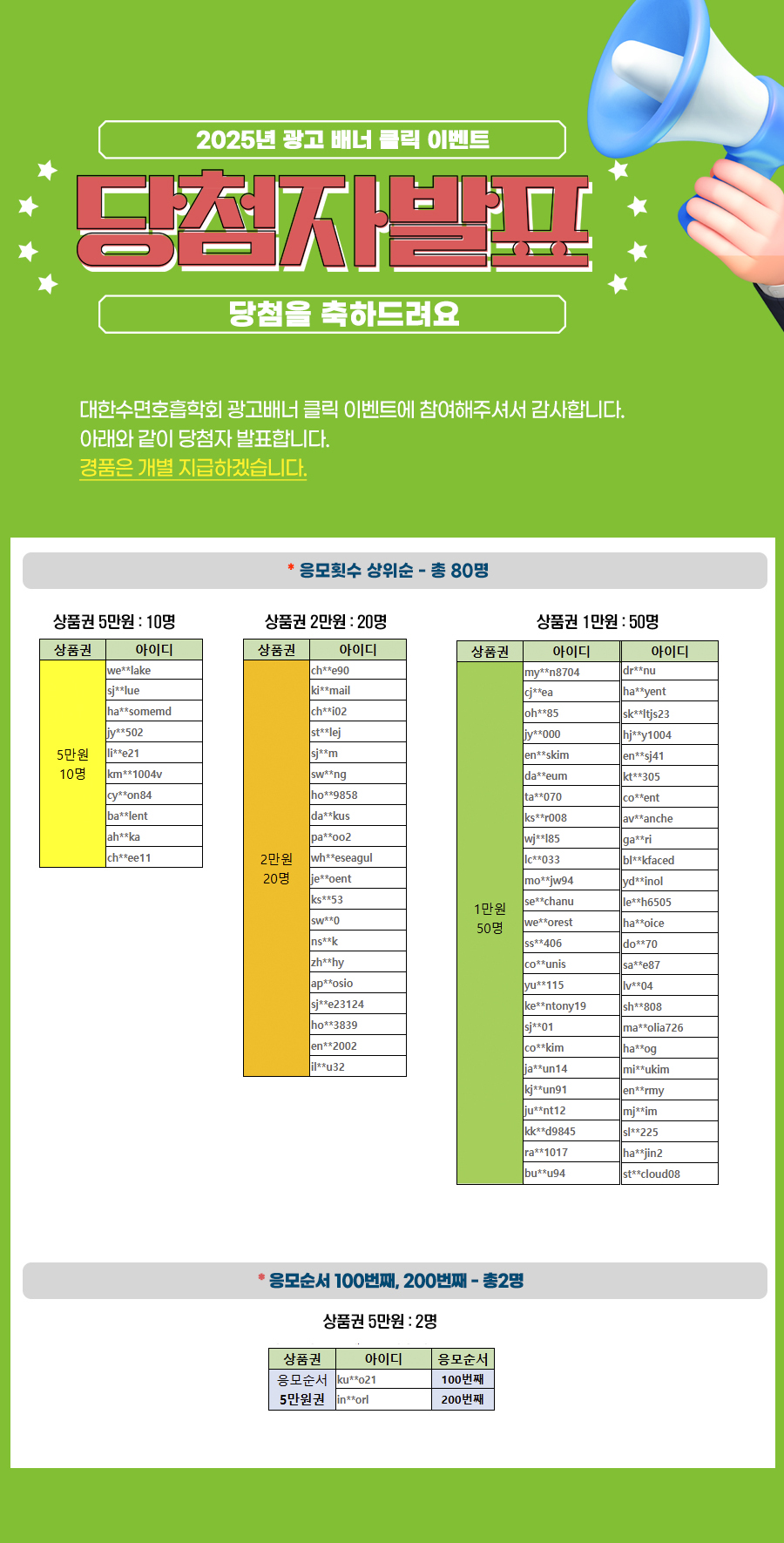 대한수면호흡학회 2025년 광고배너 클릭 이벤트 당첨자 발표