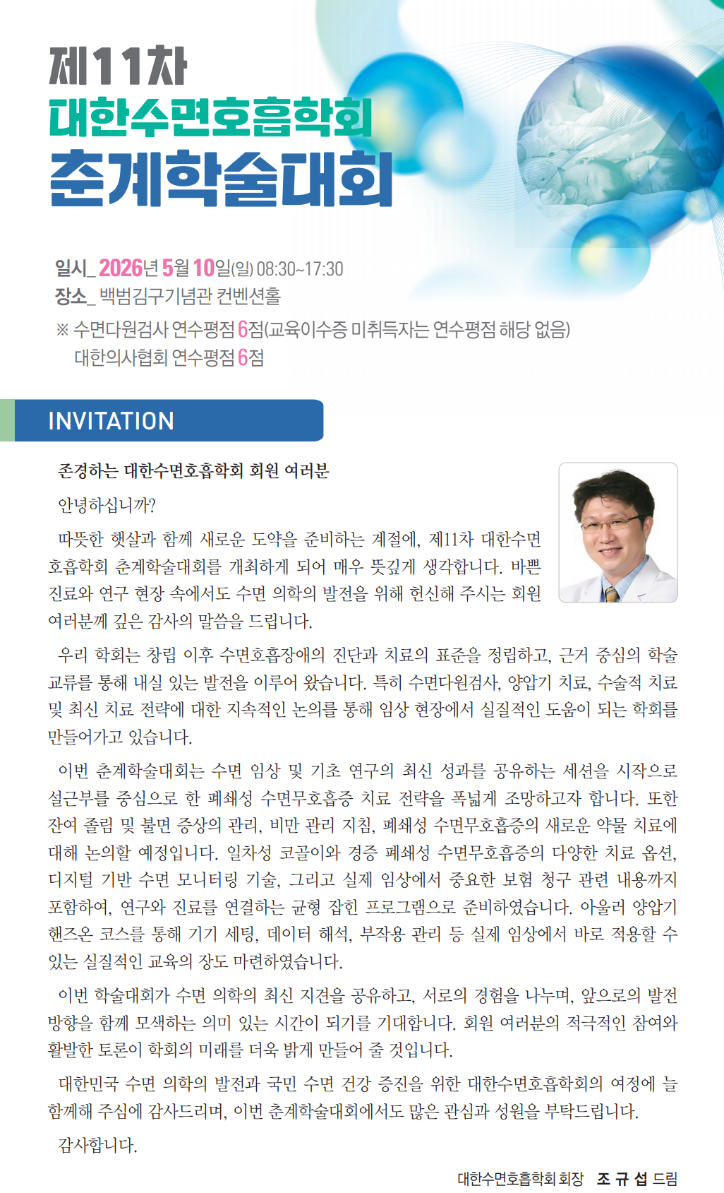 안녕하세요. 2026년도 제11차 대한수면호흡학회 춘계학술대회 및 연수강좌가 아래와 같이 개최될 예정입니다. § 일시: 2026년 5월 10일 (일) § 장소: 백범김구기념관 컨벤션홀
