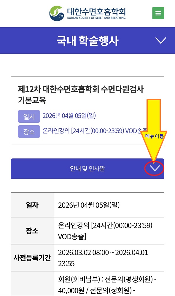 2026년 제12차 대한수면호흡학회 수면다원검사 기본교육강좌- 일 시: 2026년 4월 5일(일) - 장 소: 온라인강의 [24시간(00:00-23:59) VOD송출 - 수면다원검사 기본교육평점: 4점 *** 정도관리위원회 "수면다원검사 기본교육평점"은 전문의만 이수 가능합니다.*** "수면다원검사 기본교육평점"은 처음으로 "수면다원검사 교육이수증"을 취득하기 위해 필요한 평점입니다.이미 교육이수증 취득 하신 분들이 자격 갱신을 위해 필요한 "수면다원검사 연수평점"과는 무관합니다.VOD 강좌 홈페이지 로그인방식은 아이디가 성명 , 패스워드가 휴대폰 마지막 4자리로 구성됩니다. 예시) 홍길동 010-1234-5678 아이디 : 홍길동 , 패스워드 : 5678 사전 등록 시 성함, 면허번호, 휴대폰번호를 정확히 입력하셨는지 확인 부탁 드립니다.
