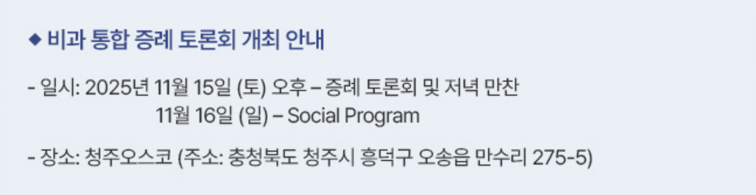 제1회 비과 통합 증례 토론회 개최 안내(2025/11/15~16)청주 오스코 By 사무국 / 2025-09-25 PM 04:29 / 조회 : 172회 |