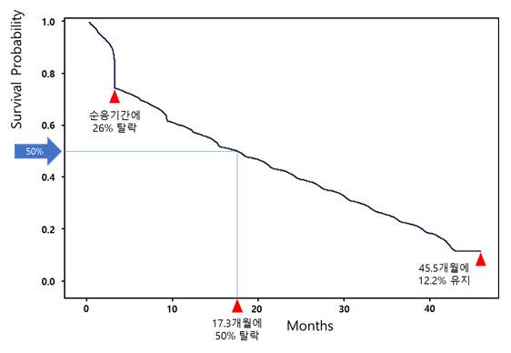 전체 추적 기간 동안 장기적으로 PAP 순응을 유지한 환자는 12.2%에 불과하였다. 중앙 추적 기간은 17.3개월이었으며, 초기 순응 기간 동안 급격한 탈락이 관찰되었고 이후에도 순응률은 지속적으로 감소하였다.